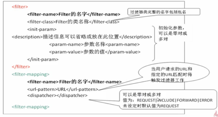 Web容器启动的时候,会加载web.xml并执行一次init()函数,然后每次客户端的请求都会执行doFilter()函数,最后当容器关闭的时候会执行destroy()函数