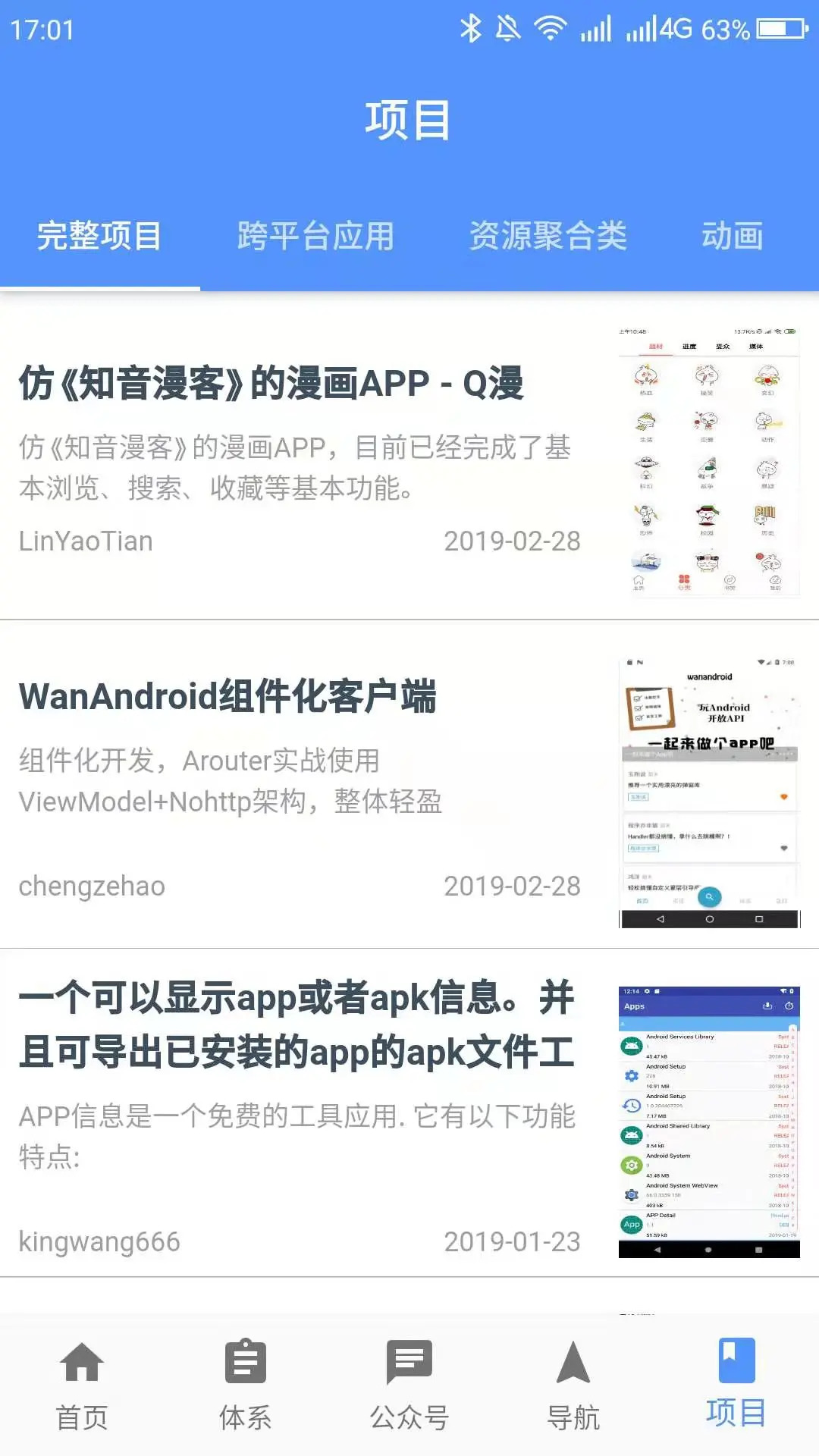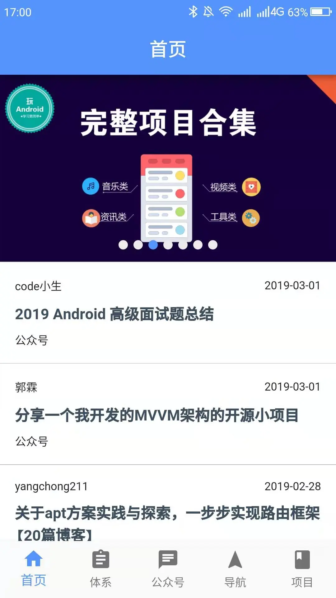 - 项目首页、知识体系、公众号、导航、项目、各个页面,和详情页面,只做了wanandroid平台的部分功能,目的是让初学者能够快速入门