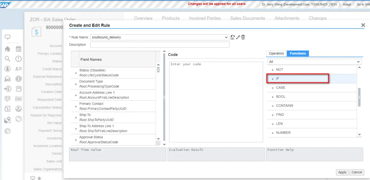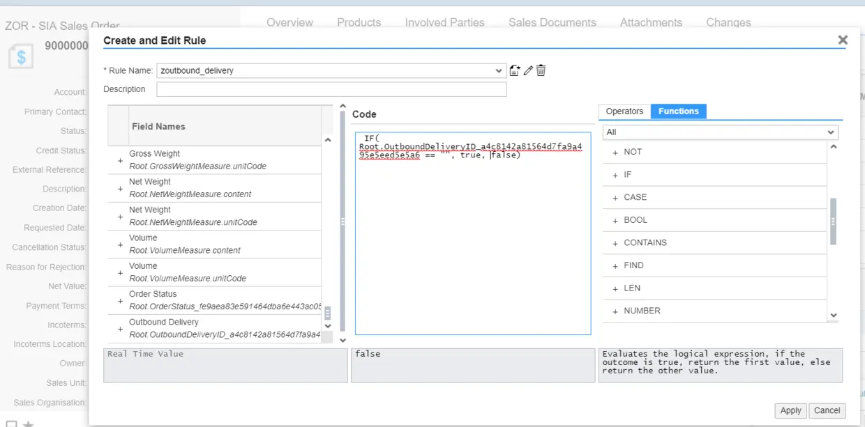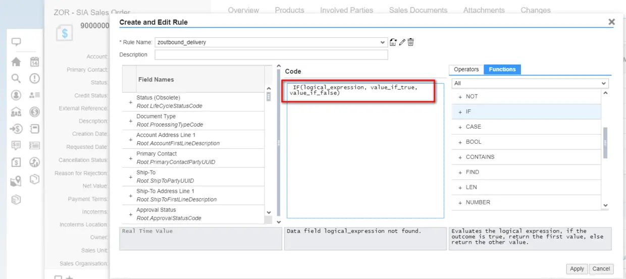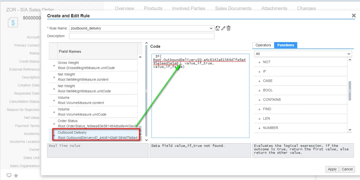 因为我的判断条件是检测Outbound Delivery字段是否有值,所以从左边Field Names里选择Outbound Delivery,单击,这个字段的名称就自动出现在中间的条件表达式里: