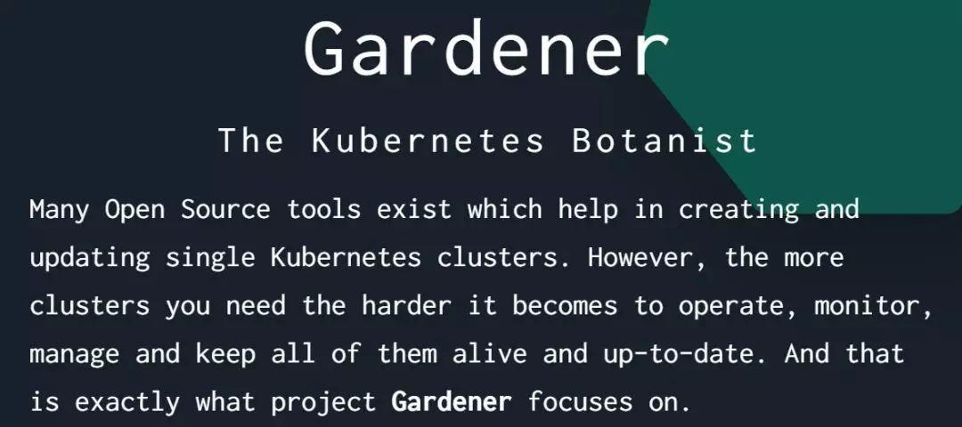 在我另一篇文章 站在巨人肩膀上的牛顿:Kubernetes和SAP Kyma 里我提到过Gardener, 一个开源的创建Kubernetes集群的解决方案: