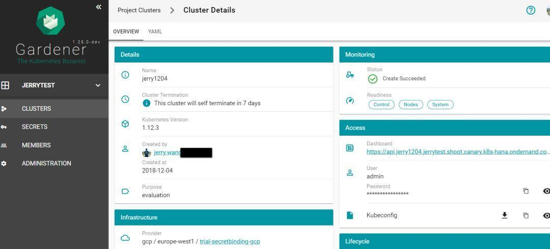 我在SAP内部的Gardener上创建一个基于Google Cloud Platform的Kubernetes集群,取名jerry1204: