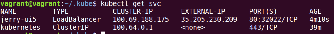 一旦expose命令执行后,get svc命令这次就返回了一个和deployment同名的service,暴露给外界访问的IP地址为35.205.230.209: