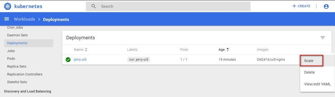 我们现在就来尝试下Kubernetes deployment的水平扩展功能。在Kubernetes操作台里选中deployment,从菜单里执行Scale命令,
