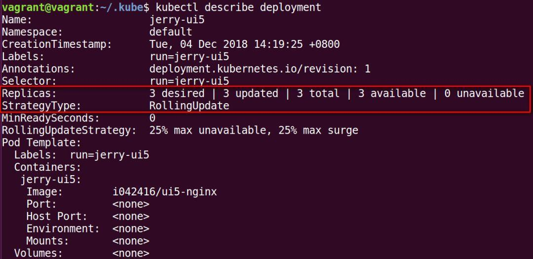 滚动升级是Kubernetes一大特色,顾名思义,这是一种平滑过渡的升级方式,通过逐个容器替代升级的方式,来实现无中断的服务升级。下图deployment的describe命令的输出,其中字段StrategyType字段表明kubectl run创建的deployment默认的升级方式就是滚动升级。