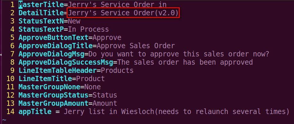 修改UI5应用明细页面的标题,在文字后加上一个**(v2.0)**, 用来表示这一版的应用为2.0版本: