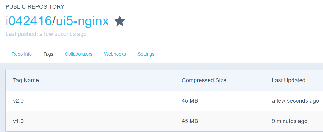 由于上一篇文章我上传到Docker Hub上的镜像的标签为默认的latest,所以我需要在Docker Hub上分别制造两个标签为v1.0和v2.0的镜像。