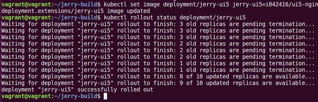 使用kubectl rollout status deployment/jerry-ui5查看滚动升级的实时进展情况。上图显示的日志表明,在某个时间点,有多少个旧版本的pod正等待被终止,有多少个新版本的pod已经处于可用状态。