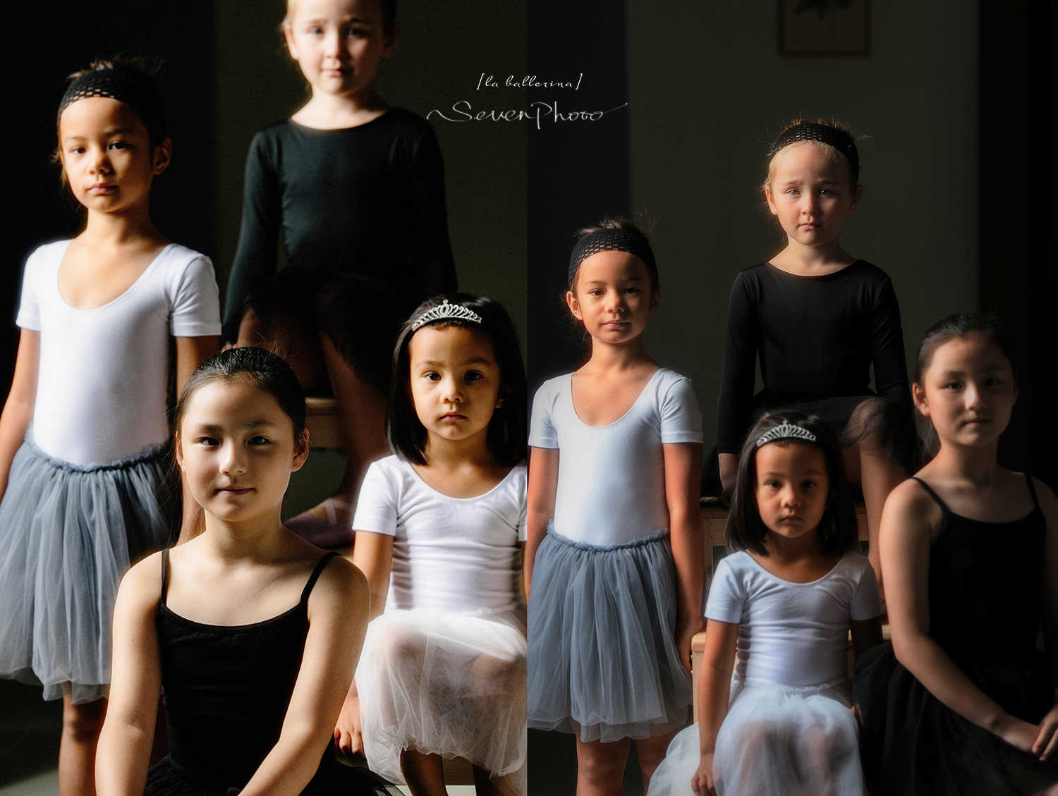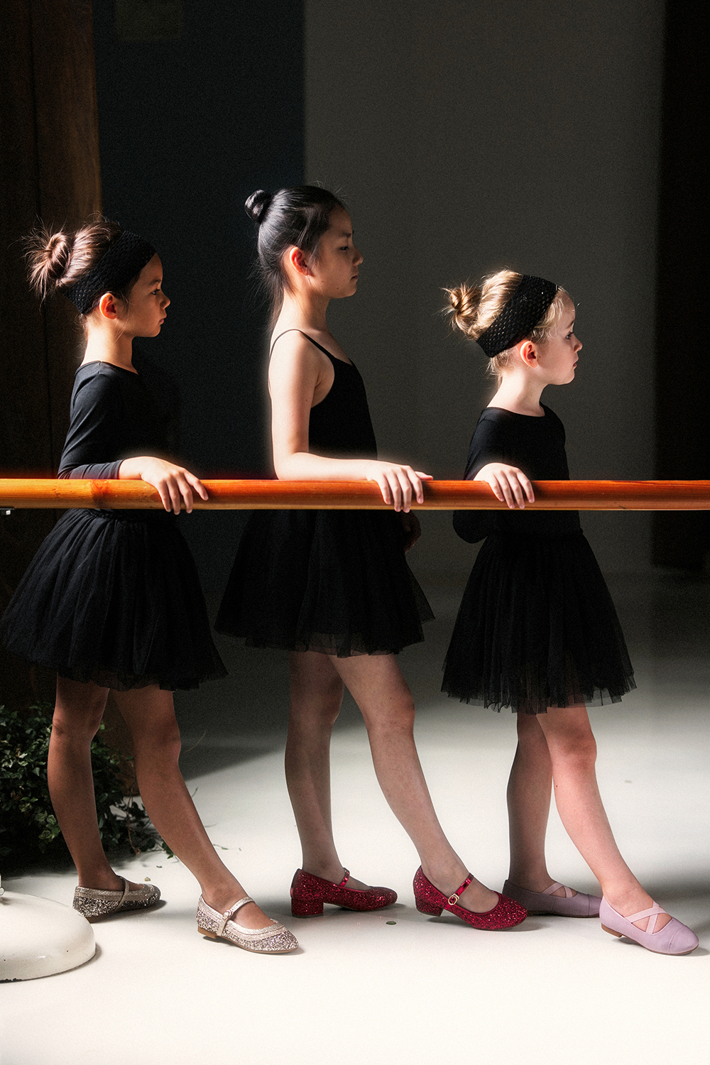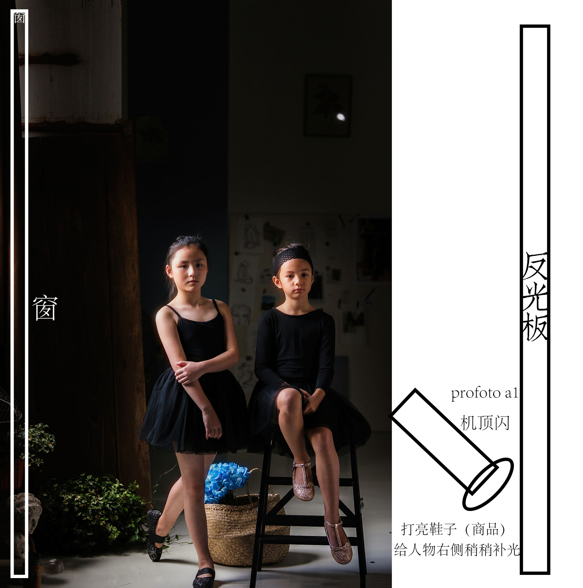 主要靠窗户打量人物的左侧脸,并且得到一个明暗对比,但右侧的姑娘太靠里面,右侧脸太黑,且鞋子吃光不足看不清,于是加了一个小闪光灯(profoto a1)反射到板上,在右侧有一个均匀轻柔的补光。