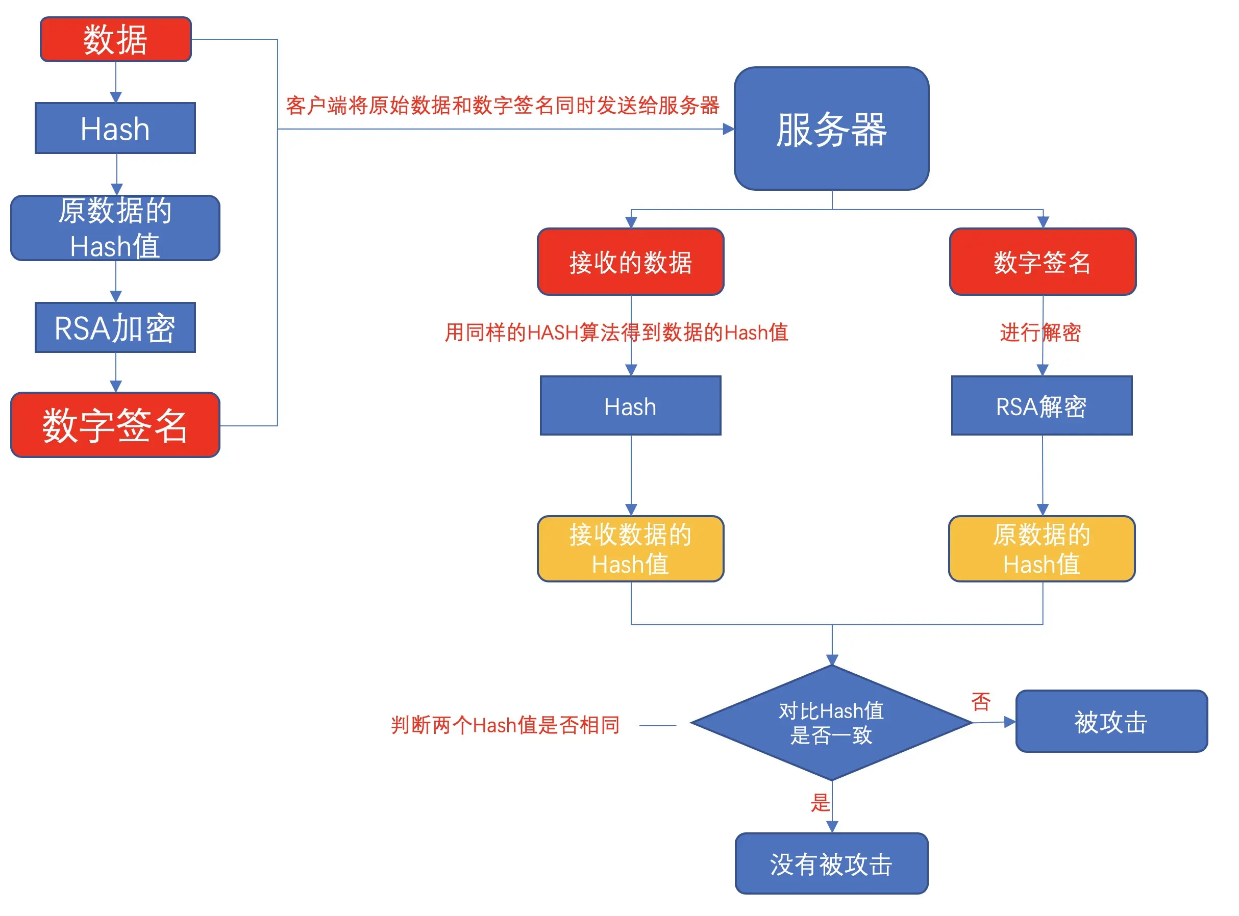 服务器对RSA加密的数据进行解密,得到原始数据的hash值,接下来对原始数据进行通过同样的Hash算法,将得到的Hash值和解密后的Hash值做对比,如果一致则保证数据有效性,整个过程中,如果解密的Hash值和原始的Hash值不一致,或者无法解密RSA的数据,说明数据被篡改了。