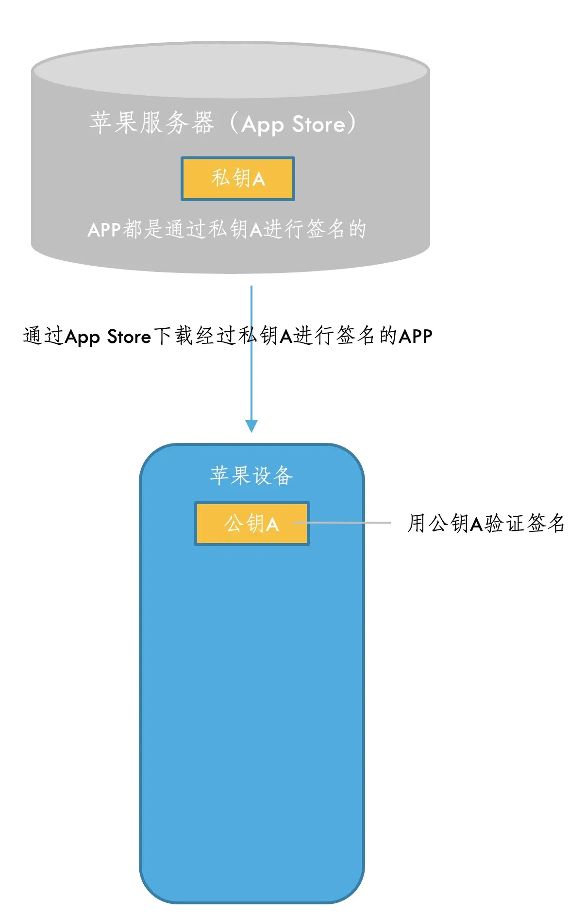 苹果也是通过代码签名来保证每一个安装到iOS上的APP都是经过苹果官方允许的,防止盗版软件、病毒入侵、静默安装等。如果想要实现验证,最简单的方式就是通过苹果官方生成非对称加密的一对公私钥,在iOS系统中内置一个与服务器对应的公钥,私钥由苹果后台来保存,我们传APP到App Store时,苹果后来用私钥对APP数据进行签名,iOS系统下载这个APP后,用公钥验证这个签名,如果签名正确则这个APP肯定是由苹果后台认证的,并且没有被修改或损坏。