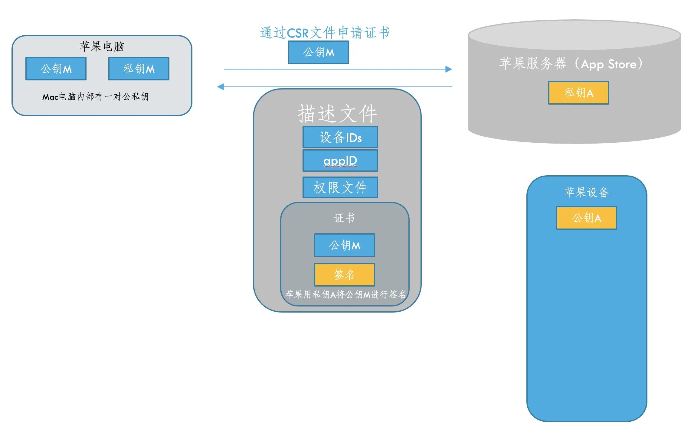 用一个CSR文件(就是在钥匙串访问中,证书助理,从证书颁发机构中获取的)向苹果申请一个证书,这个CSR文件主要包含了一个公钥文件,还有一些信息,比如邮箱、名字、签名信息、Hash值等等,苹果收到请求后,会用私钥A将公钥M进行签名,以供苹果设备进行验证(用公钥A进行验证)。苹果服务器将公钥M和签名信息打包成证书,并把appID、证书、设备IDs、权限文件等放入描述文件一并返回给Mac电脑,以备Mac电脑用这个描述文件中的证书到iOS设备去验证。