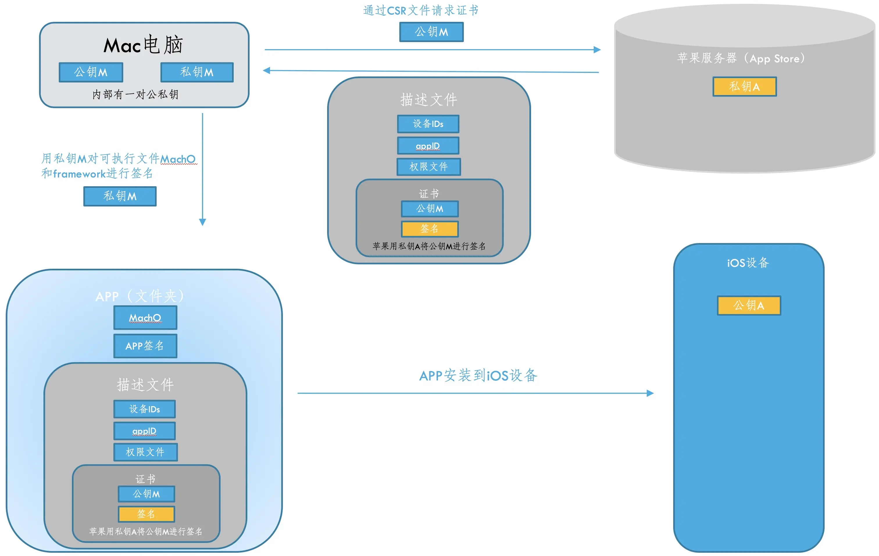 iOS设备上的APP其实都是文件夹,最重要的是可执行文件MachO和framework,APP签名也就是对它俩进行签名,通过Mac电脑的私钥M对文件进行签名,把这个签名和从苹果申请的描述文件一并放入到APP中。当安装APP时,iOS设备用公钥A来解析描述文件中的证书进行验证证书的有效性,通过之后将证书中的公钥M拿出来,再去验证APP签名的有效性,这样就可以验证当前APP是否是苹果官方允许的。