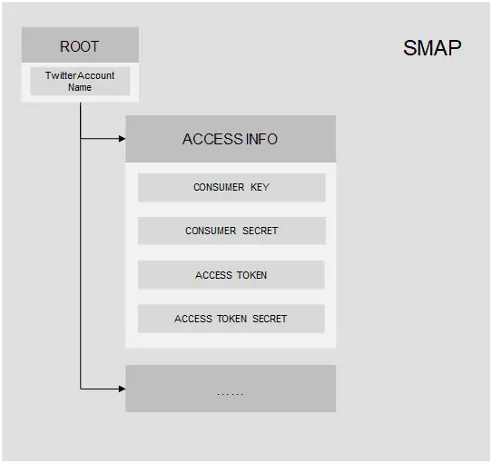 SMAP,全称Social Media Activity Provider,对应的就是Social Media Channel。刚刚提到的Twitter官方账号和Channel的关联,以及关联配置时输入的设置信息都存储在下图所示的ACCESS INFO子节点中。
