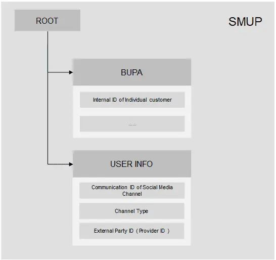 SMUP,全称Social Media User Profile, 每一个Twitter的个人账号对应一个SMUP BO实例。图示的BUPA子节点关联到一个BP 信息(例子中是Individual Customer),USER INFO子节点中存储的是其对应的社交媒体信息,对于Twitter和Facebook账号来说,只需要指定Channel Type和Communication ID即可,同一个BP的Twitter对应的SMUP只会有一个。微信稍有不同,后面再做解释。