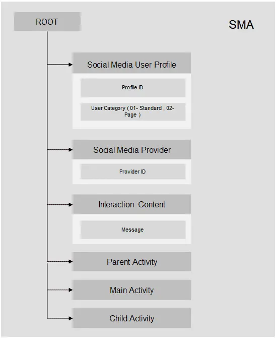 SMA,全称Social Media Activity,也叫Social Media Message(消息),每一次对话对应一条该BO的实例,包含了消息来源用户的SMUP信息、消息来源的Channel信息(SMAP)、消息内容(Interaction Content)等,根据一定的逻辑判断是否创建Ticket。以客服人员回复Ticket生成的SMA为例,Main Activity负责存储生成Ticket的消息,Parent Activity为客服回复所针对的消息,如果用户再次回复了客服,那么此条回复消息即为Child Activity。这样保证了一系列的会话和回复可以有序地串起来。