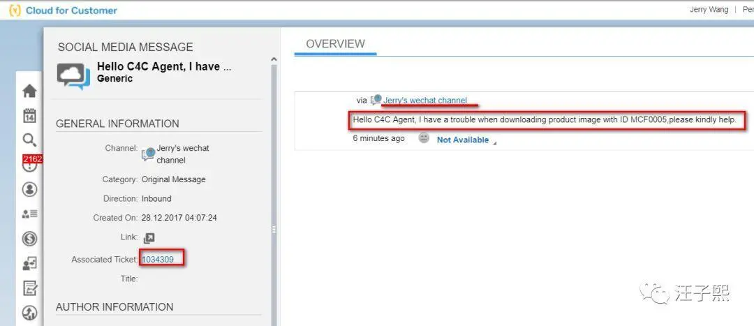 讨论完Twitter,我们再来看看大家更加熟悉的微信。微信与C4C Ticket的集成与Twitter/Facebook相比有着很大的差异。