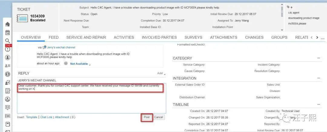 通过上面介绍的集成场景,在C4C自动生成了一个Ticket: