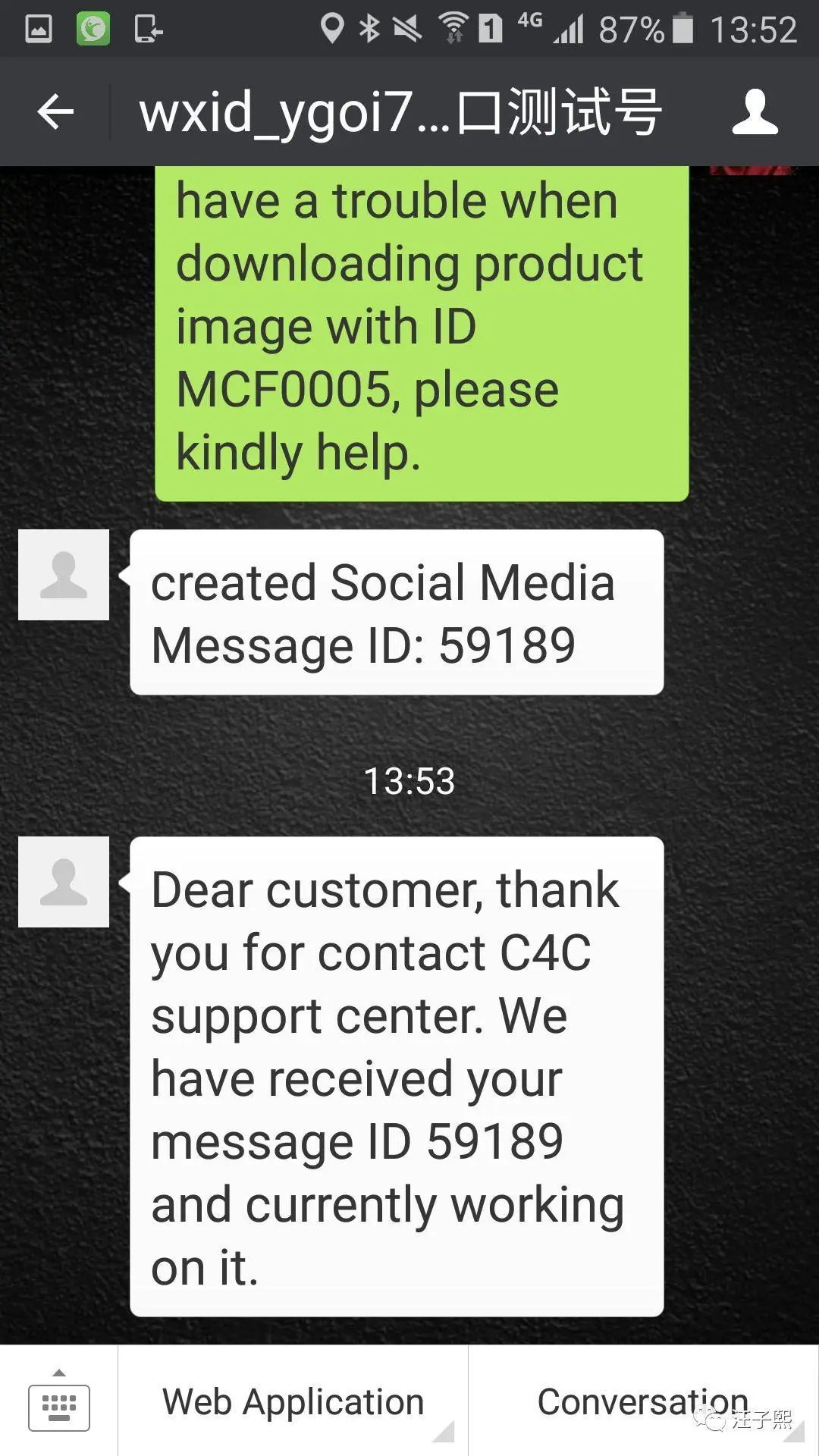 客户在自己的微信客户端上收到了C4C客服人员的回复:
