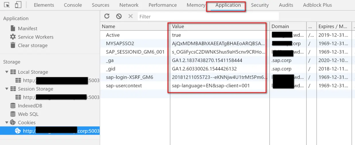 这些cookie信息能够在Chrome开发者工具的Application标签页里的Cookies区域查看:
