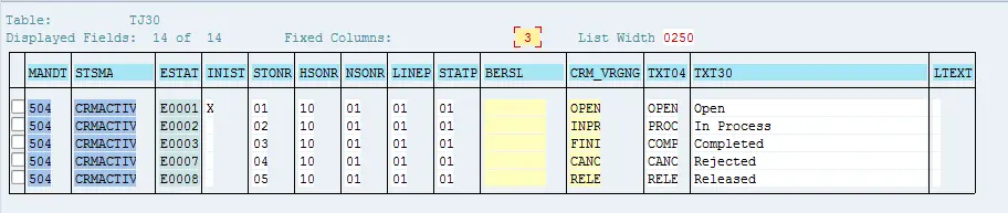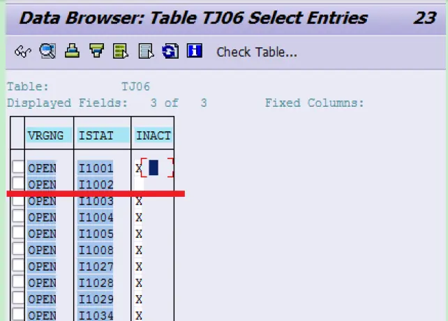 系统从step2里取得business transaction之后,根据VRGNG = transaction的逻辑到TJ06里去查找所有结果INACT不为X的entry,结果即为该user status对应的所有system status