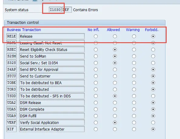 其中I1030是system status,它对应的releases这个user status 的配置是forbidden,意思是当transaction上有error的时候,改变transaction的状态到released是被禁止的。所以在Web UI上新建一个task的时候,因为还有很多字段没有维护,所以transaction的system status是contains error - I1030的状态,Page上的每次change操作都会触发状态检查,一旦有I1030这个状态,对应的released user status就会从drop down list中拿掉。