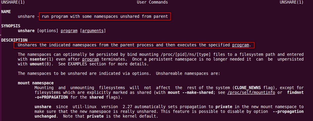 在Linux里,父进程fork的子进程会继承父进程的命名空间。与这种行为相反的一个系统命令就是unshare: