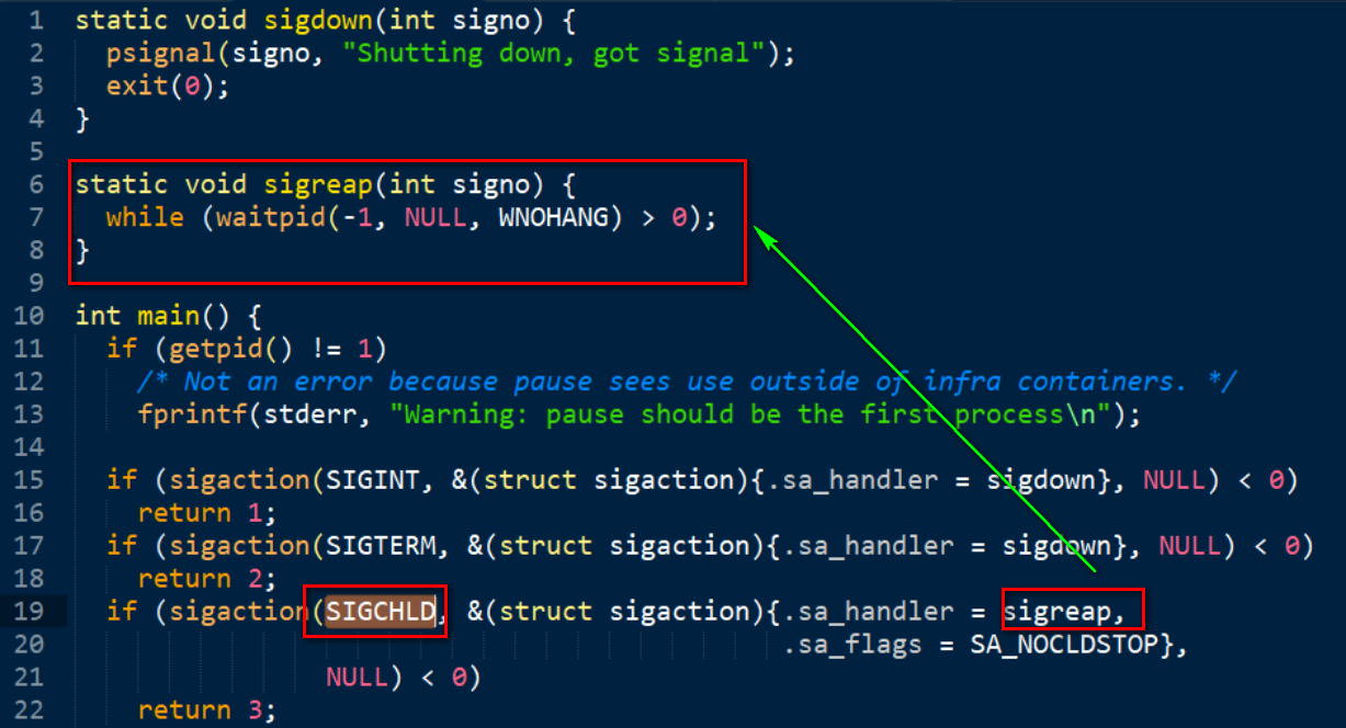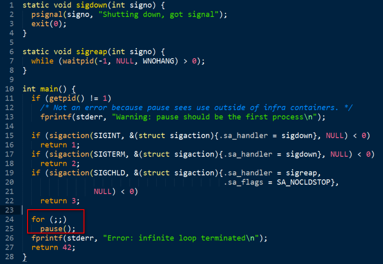 其中第24行里一个无限循环for(;;), 至此大家能看出来pause容器名称的由来了吧?