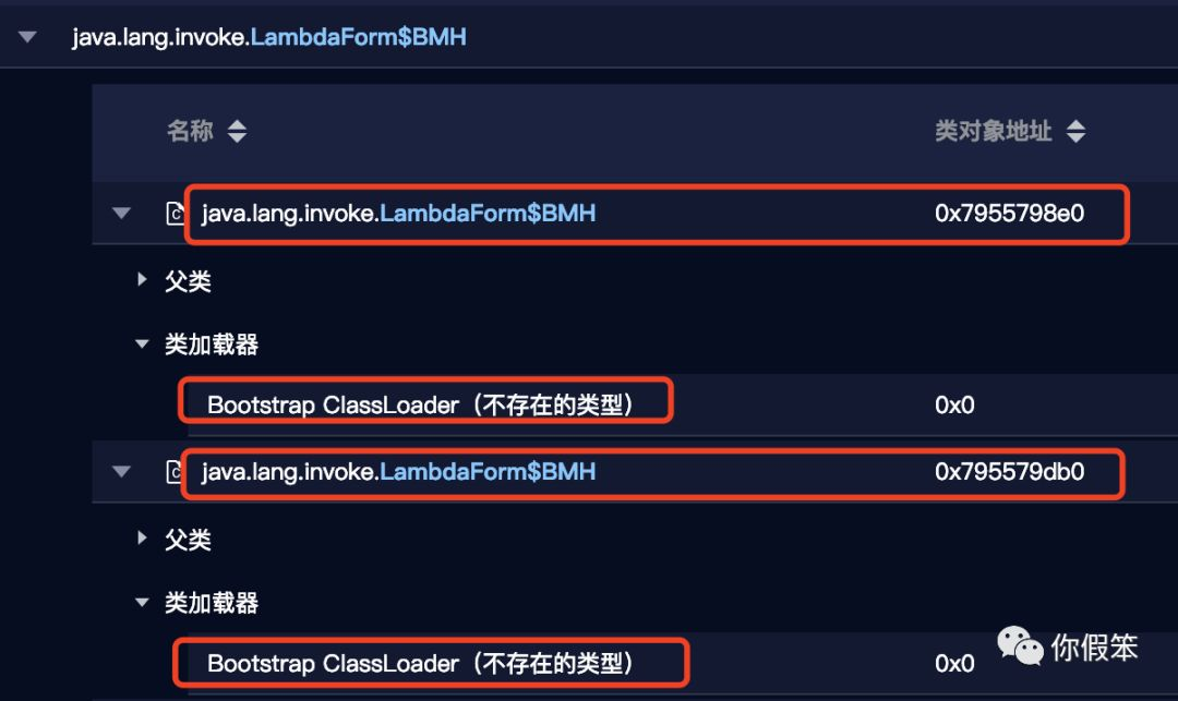 在这个现象里,名字为java.lang.invoke.LambdaForm$BMH的类有多个,并且其类加载器都是BootstrapClassLoader,也就是同一个类加载器居然加载了同一个类多次。这是我们的分析工具有问题吗?显然不是,因为我们从内存里读到的就是这样的信息。