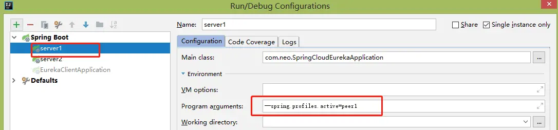 通过设置Program arguments参数启动2个Server端