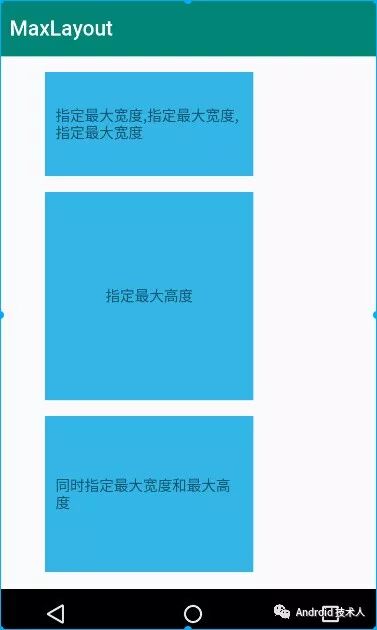 1<com.xj.maxlayout.MaxLayout 2 android:layout_width="match_parent" 3 android:layout_height="100dp" 4 android:layout_marginTop="15dp" 5 android:background="@android:color/holo_blue_light" 6 app:ml_maxWidth="200dp"> 7 8 <TextView 9 android:layout_width="match_parent"10 android:layout_height="wrap_content"11 android:layout_gravity="center"12 android:padding="10dp"13 android:text="指定最大宽度,指定最大宽度,指定最大宽度" />1415</com.xj.maxlayout.MaxLayout>1617<com.xj.maxlayout.MaxLayout18 android:layout_width="200dp"19 android:layout_height="match_parent"20 android:layout_marginTop="15dp"21 android:background="@android:color/holo_blue_light"22 app:ml_maxheight="200dp">2324 <TextView25 android:layout_width="match_parent"26 android:layout_height="match_parent"27 android:layout_gravity="center"28 android:gravity="center"29 android:padding="10dp"30 android:text="指定最大高度" />3132</com.xj.maxlayout.MaxLayout>3334<com.xj.maxlayout.MaxLayout35 android:layout_width="wrap_content"36 android:layout_height="match_parent"37 android:layout_marginTop="15dp"38 android:background="@android:color/holo_blue_light"39 app:ml_maxWidth="200dp"40 app:ml_maxheight="150dp">4142 <TextView43 android:layout_width="match_parent"44 android:layout_height="wrap_content"45 android:layout_gravity="center"46 android:padding="10dp"47 android:text="同时指定最大宽度和最大高度" />4849</com.xj.maxlayout.MaxLayout>