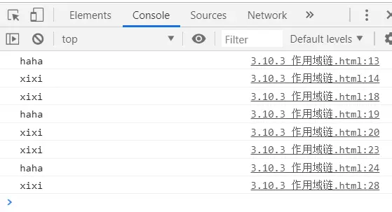 7 console.log(name); 大家认为第6行和第7行代码输出的结果应该是什么?好了,答案是:输出结果结果分别是 undefined 和 haha。为什么是undefined? 按照作用域链的思路思考,输出的结果应该是 haha或者xixi啊? (当然大家都知道 xixi是不可能的,因为解析器在解析第3行代码时,还不知道第4行中的赋值内容)。