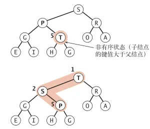 - 当某个结点的优先级上升(或是在堆底加入一个新的元素)时,我们需要由下至上恢复堆的顺序