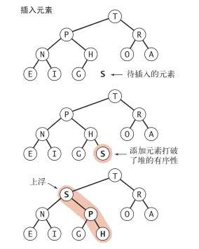 将新元素添加到数组尾部,增加堆大小并让这个新元素上浮到合适的位置