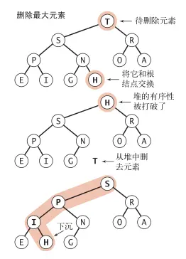因为某个结点变得比它的两个子节点或是其中之一更小而被打破,那么我们就需要通过将它和它的两个子节点中较大者交换来恢复堆,直到该结点的子节点都比它更小或者到达了堆底。