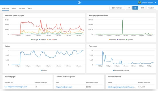 Raygun是领先的错误监控以及崩溃报告的平台。应用程序性能监控(APM)是其最近的项目。Raygun的DevOps工具帮助用户分析性能问题,并且定位到代码的某一行,某个function或者API调用。APM工具和Raygun的错误管理工作流可以协同工作。比如,它自动定位最高优先级的问题,并创建issue。