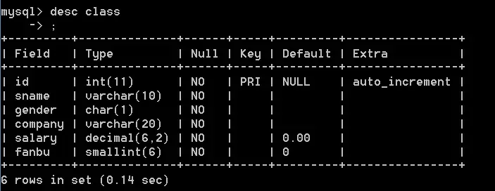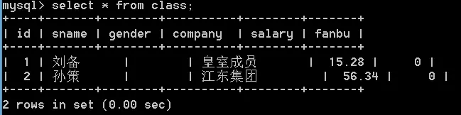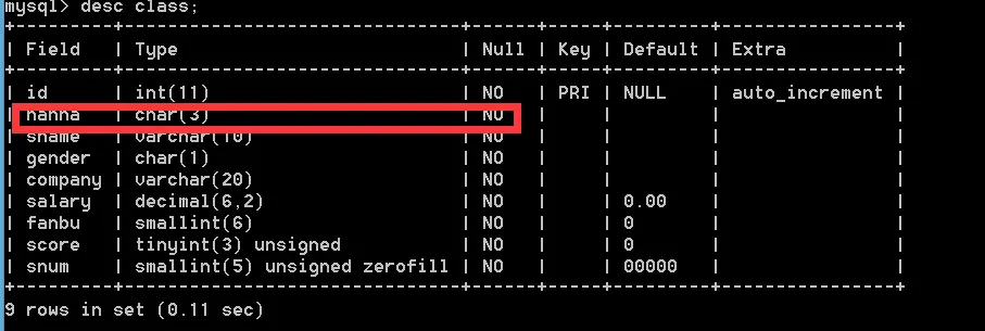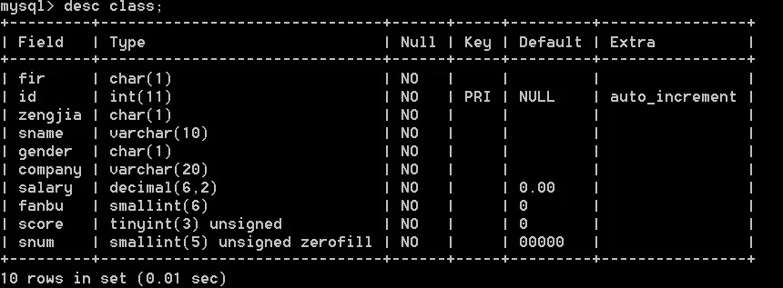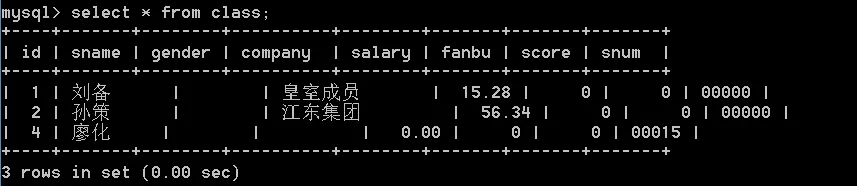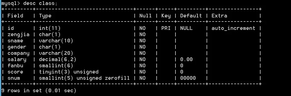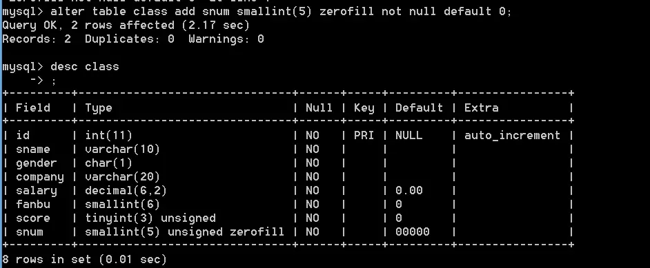 alter table class add snum smallint(5) zerofill not null default 0;这里可以看到snum这一个字段default默认是5个0,我们加一些数据进去,看看效果
