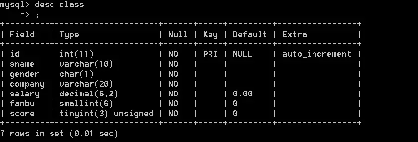 alter table class add score tinyint unsigned not null default 0# 在指定的地方增加一列,比如我们在上图的基础上,指定在id列后面增加一列