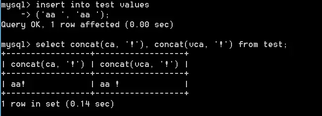 select concat(ca, '!'), concat(vca, '!') from test;