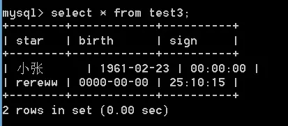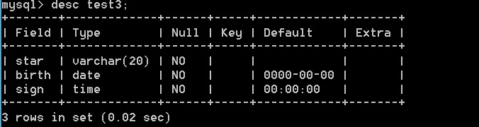 alter table test3 add sign time not null default '00:00:00';# 插入数据