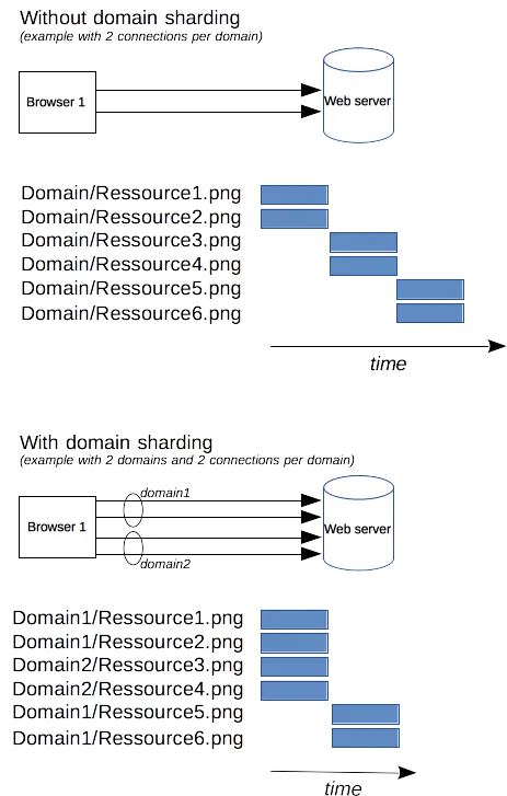 除非你有紧急而迫切的需求,不要使用这一过时的技术,升级到 HTTP/2 就好了。在 HTTP/2 里,做域名分片就没必要了:HTTP/2 的连接可以很好的处理并发的无优先级的请求。域名分片甚至会影响性能。大多数 HTTP/2 的实现还会使用一种称作连接凝聚的技术去尝试合并被分片的域名。