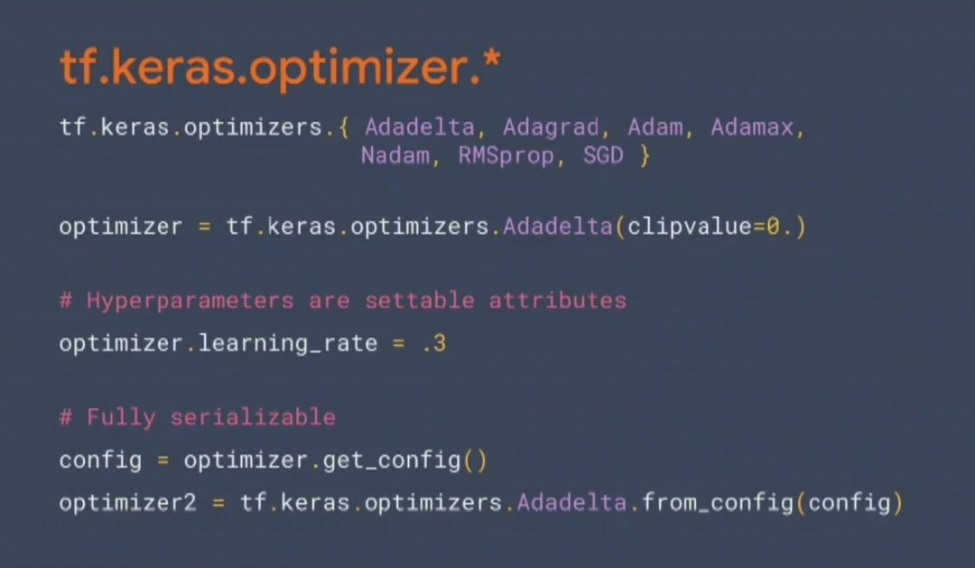 例如,对tf.keras.optimizer\ tf.keras.layers\ tf.keras.loss等一些列高级API都做了“易用性”的优化。例如: