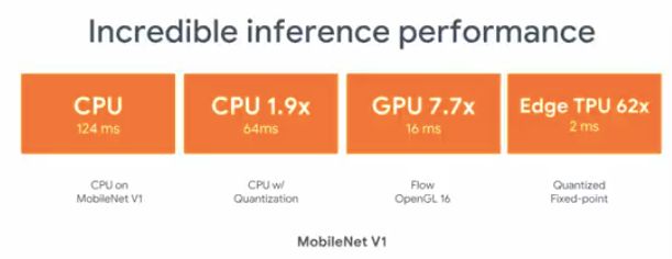 有多快呢?训练 MobileNet v1,CPU、GPU 和 Edge TPU 下推理速度分别提升了 1.9倍、7.7 倍和 62 倍!