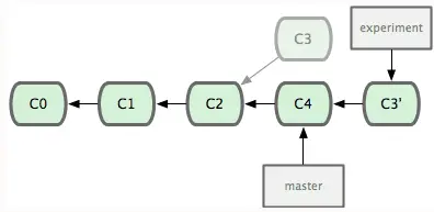 原理其实就是回到两个分支最近的共同祖先。然后根据当前所在分支后续的历次提交,生成一系列文件补丁,然后以base分支最后一个提交对象为新的出发点,进行总打包。最后成为新的最近补丁。拓扑如下: