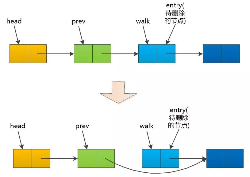 remove_list_entry(entry){ prev = NULL; walk = head; // Walk the list while (walk != entry){ prev = walk; walk = walk -> next; } // Remove the entry by updating the // head or the previous entry if (!prev) head = entry->next; else prev->next = entry->next;}