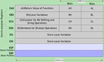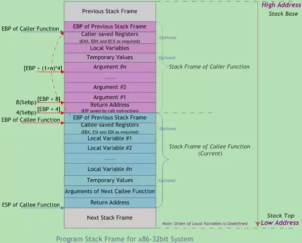 - 栈帧逻辑:栈帧的边界由栈帧基地址指针EBP和堆栈指针ESP界定(指针存放在相应寄存器中)。EBP指向当前栈帧底部(高地址),在当前栈帧内位置固定;ESP指向当前栈帧顶部(低地址),当程序执行时ESP会随着数据的入栈和出栈而移动。因此函数中对大部分数据的访问都基于EBP进行。