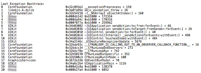 日志内包含符号化内容-[__NSArrayI objectAtIndex:]和十六进制地址0x000db142 0xb1000 + 172354。这种日志类型成为部分符号化崩溃日志。
