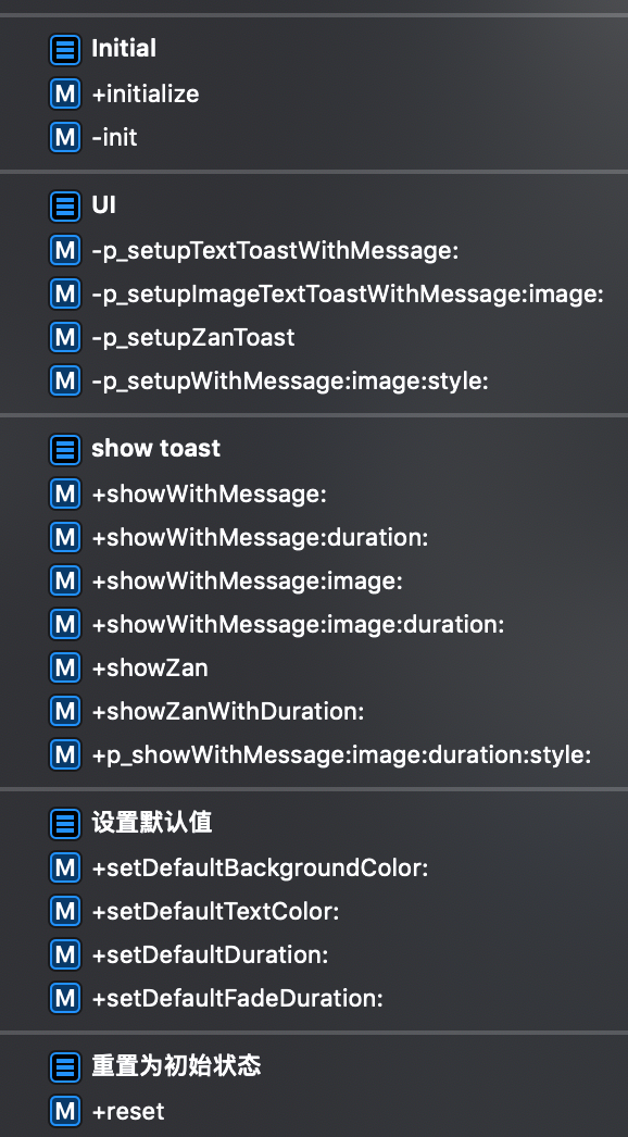 我一般只会在封装比较通用的库时才给私有方法加前缀,比如说我封装了一个toast(地址:github.com/CaiWanFeng/…,强行推广一波哈哈哈),公有方法不少: