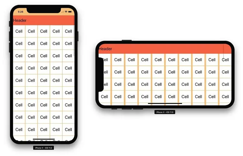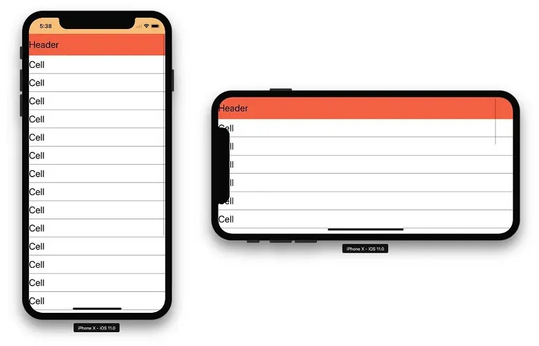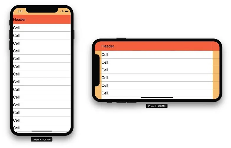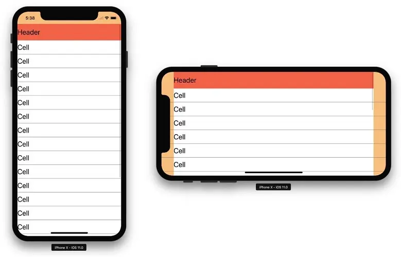 自定义的 header 上面有一个 lable,自定义的 cell 上面也有一个 label。将屏幕横屏之后会发现,cell 以及 header 的布局均自动留出了 safe area 以外的距离。cell 还是那么大,只是 cell 的 contnt view 留出了相应的距离。这其实是 UITableView 中新引入的属性管理的: