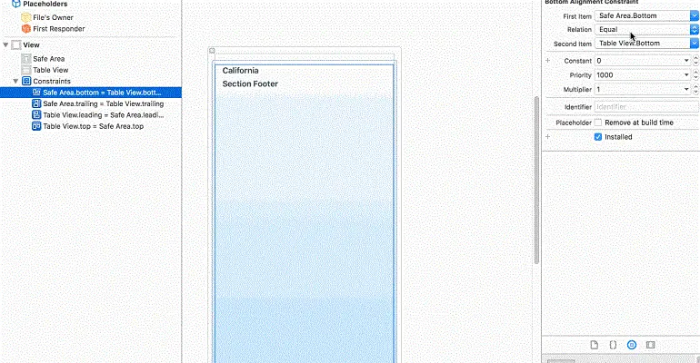 我们现在再来看一下 UITableView 中 safe area 的情况。我们先添加一个有自定义 header 以及自定义 cell 的 tableview。设置边框为 self.view 的边框。也就是
