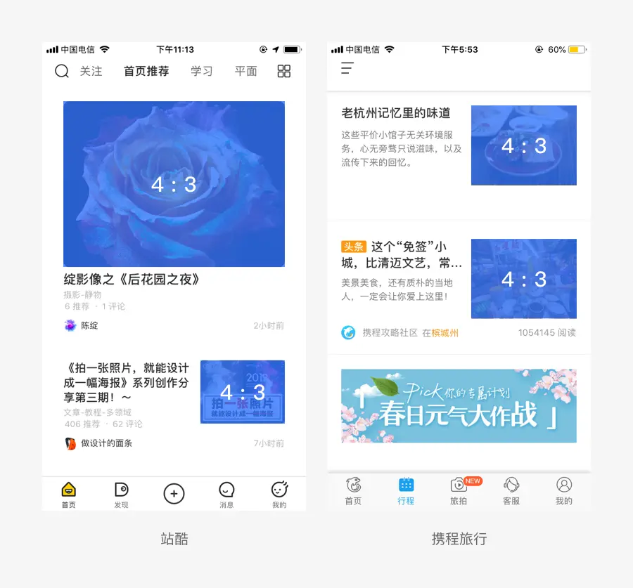 4:3 的图片比例可以使图像更紧凑,更易构图,方便设计师进行发挥。由于手机屏幕容量较小,作为全屏展示时,该比例在产品设计布局上面占用空间较大,通常我们作为分栏来进行界面布局。